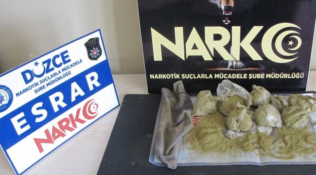 Açıklama şöyle;Düzce İl Emniyet Müdürlüğü görevlilerince, düzce Cumhuriyet Başsavcılığı koordinesinde yürütülen çalışmada;İlimiz TEM Otoyolu Ankara istikameti Yeni Bağlantı yolu üzerinde durumundan şüphelenilerek durdurulan araç içerisinde bulunan şüpheli 2 (iki) şahıs yakalanmıştır.Yakalanan şüphelilerin kullanımında bulunan araçta ve şahısların üzerinde yapılan aramalarda 410 gram toz esrar maddesi ve bir miktar skunk maddesi ele geçirilmiştir.Şüpheli 2 (iki) şahıs hakkında uyuşturucu Madde Bulundurmak Kullanmak suçundan tahkikata başlanmıştır.