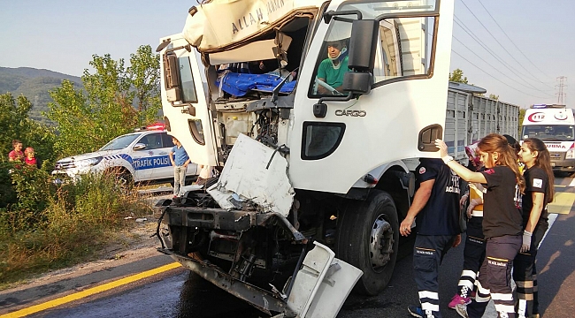Düzce'de lastikleri ısınan kamyon duramayarak önce 3 araca çarparak durabildi. Kamyonun içinde sıkışan sürücü itfaiye ekiplerince sıkıştığı yerden çıkarılarak hastaneye kaldırıldı.