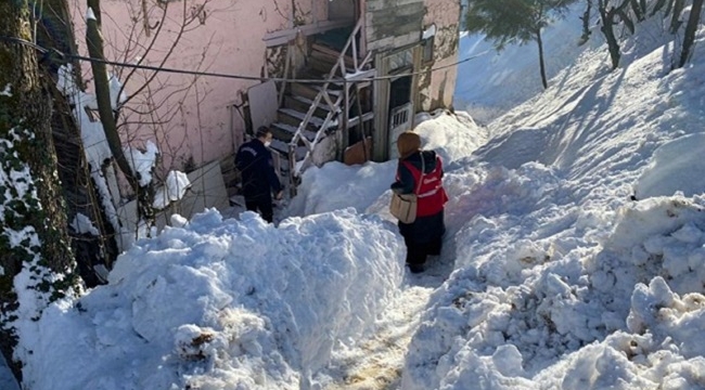 Düzce'nin Yığılca ve Gölyaka ilçelerinde kar nedeniyle ulaşımda zorluk yaşanan evlerdeki vatandaşlara Türk Kızılay ekipleri tarafından gıda malzemesi dağıtıldı.