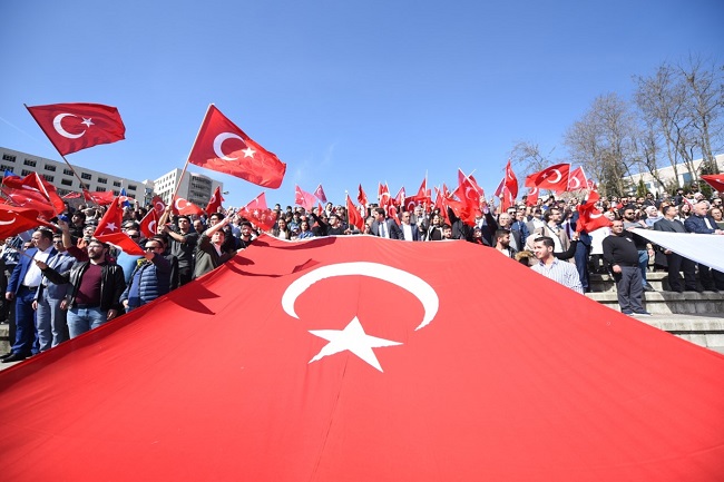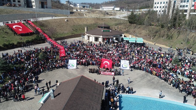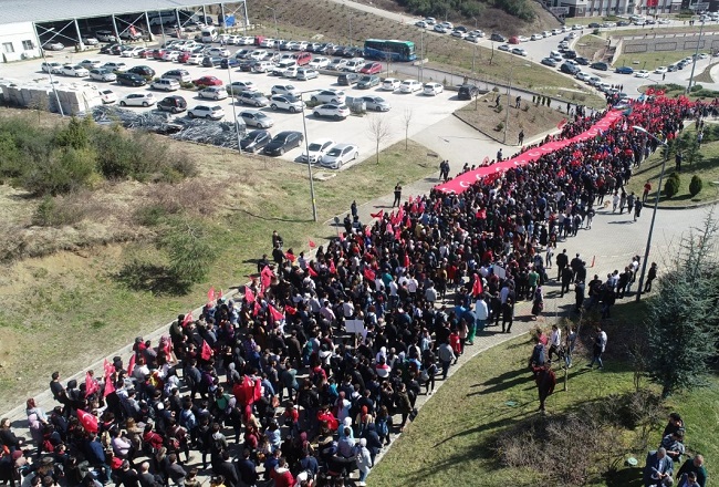 Rektörlük binası önünde başlayan ve 10 bine yakın katılımla adeta sel olup akan Düzce Üniversitesi mensupları, bağımsızlığımızın sembolü Türk bayraklarını gururla taşıyarak Suriye rejim güçlerinin menfur saldırısını kınadı. Bahar Kalkanı harekatıyla şehitlerimizin kanını yerde bırakmayan kahraman Mehmetçiklerimize desteklerini canı gönülden ve hep bir ağızdan haykırdı.Konuralp Kampüsünde gerçekleştirilen, ellerinde Türk bayrakları; “Şehitler Ölmez Vatan Bölünmez”, “Sefer Bizden Zafer Allah’tan”, Bir Ölür Bin Diriliz” gibi anlamlı dövizlerle birlik beraberlik mesajı veren Düzce Üniversitesi, Ülkemize, Bayrağımıza ve Türk Silahlı Kuvvetlerimize bağlılığını her zaman olduğu gibi bir kez daha gösterdi.