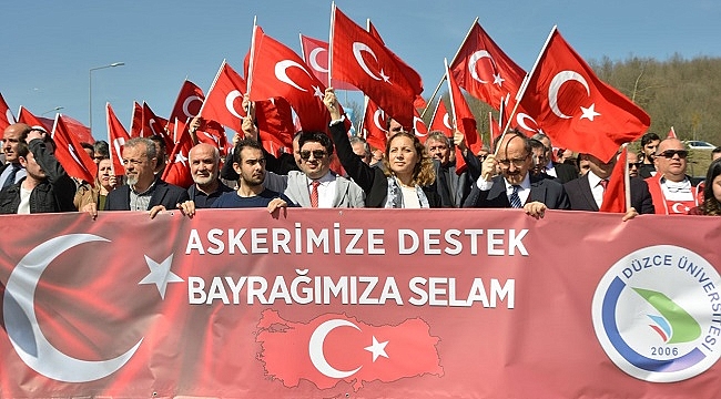 Düzce Üniversitesi; Ülkemizin bölünmez bütünlüğü ve güvenliği için kahramanca savaşarak Suriye’de şehit düşen askerlerimize saygı, Bahar Kalkanı Harekatı’na destek ve şanlı Bayrağımıza bağlılığımızı göstermek amacıyla “Askerimize Destek Bayrağımıza Selam” Yürüyüşü düzenledi.Bu anlamlı yürüyüşe; düzce Üniversitesi Rektörü Prof. Dr. Nigar Demircan Çakar, Rektör Yardımcıları Prof. Dr. İlhan Genç, Prof. Dr. İdris Şahin ve Prof. Dr. Mehmet Akif Öncü, Genel Sekreter Hasan Sadi Ateş, akademik ve idari birim yöneticileri, personeller, öğrenciler ile Azerbaycan, Kuzey Kıbrıs Türk Cumhuriyeti, Kazakistan, Kırgızistan, Özbekistan gibi Türki Cumhuriyetlerden çok sayıda Düzce Üniversitesi öğrencisi katıldı.