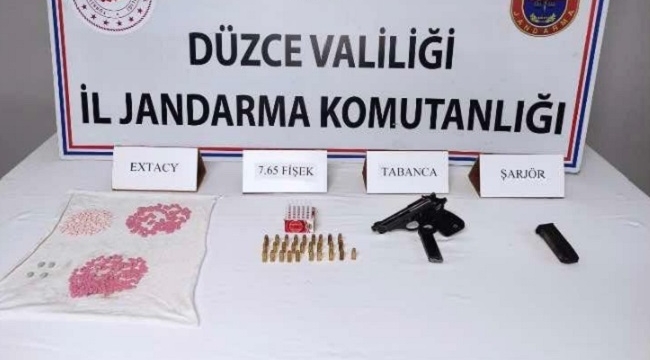 Düzce Merkeze bağlı İstilli köy yolunda devriye görevi yapan Jandarma ekipleri, şüphe üzerine A.Ö.‘nün kullandığı aracı durdurdu. Araçta yapılan aramalarda, 310 adet uyuşturucu hap ele geçirildi. Şüpheli şahsın Gümüşova'daki evinde yaptıkları aramada ise 1 adet tabanca, 28 adet fişek ve 2 adet şarjör bulundu. Olayla ilgili soruşturma sürüyor.