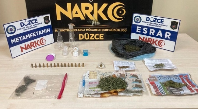 Düzce İl Emniyet Müdürlüğü Narkotik Suçlarla Mücadele Şube Müdürlüğü ekiplerince uyuşturucu operasyonu düzenlendi.Olay 1:Düzce merkezinde Uyuşturucu Madde Ticareti yaptığı tespit edilen şüpheli 2 (iki) şahıs yapılan operasyon neticesinde yakalandı.Yakalanan şüphelilerin üzerlerinde ve içerisinde bulundukları araçta yapılan aramada 52 gram Metamfetamin, 100 gram Esrar, bir miktar Sentetik Kannobinoid, 15 adet tabanca Fişeği ve Uyuşturucu Madde İçiminde kullanılan 2 adet aparat ele geçirildi. Şüpheli şahıslar tamamlanan işlemlerinin ardından Uyuşturucu Madde Ticareti Yapmak suçundan sevk edildiği Sulh Ceza Hakimliğince 1 şahıs tutuklandı, 1 şahıs savcılıktan serbest kaldı.Soruşturma kapsamında işlem yapılan şahıslardan uyuşturucu madde aldığı tespit edilen 2 şahıs hakkında ayrıca Uyuşturucu Madde Ticareti Yapmak ve Uyuşturucu Madde Bulundurmak Kullanmak suçundan adli işlem yapıldı, şahıslardan 6 gram Metamfetamin maddesi ele geçirildi.
