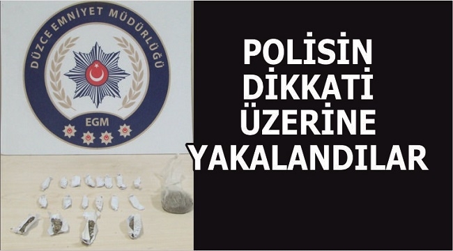 düzce il Emniyet Müdürlüğü ekipleri tarafından Düzce Cumhuriyet Başsavcılığı koordinesinde yürütülen soruşturma kapsamında Asayiş Şube Müdürlüğü Yunus ekiplerince Aziziye Mahallesi Eski SSK Hastanesi civarında yürütülen devriye hizmetlerinde durumundan şüphelenilen 2 şahıs durduruldu. Şahısların üzerilerinde yapılan aramada satışa hazır vaziyette uyuşturucu madde ele geçirilerek gözaltına alındılar. Şüpheli şahısların üzerlerinde ve ikametlerinde yapılan aramalarda satışa hazır vaziyette 18 fişek halinde toplam daralı 30 gram sentetik kannabinoid maddesi ve bir miktar extacy hap ele geçirildi.