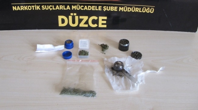 Düzce Emniyeti'ne bağlı Narkotik timleri uyuşturucu operasyonu düzenlendi.Yapılan açıklama şöyle;“Düzce İl Emniyet Müdürlüğü Narkotik Suçlarla Mücadele Şube Müdürlüğü ekiplerince, düzce Cumhuriyet Başsavcılığı koordinesinde sokak satıcısı ve torbacı olarak tabir edilen şahıslara yönelik yürütülen planlı/projeli çalışmalarda;İlimiz Duraklar Köyünde Uyuşturucu Madde Ticareti yaptığı tespit edilen 1 (bir) şahıs 20.11.2019 günü yakalanmıştır.Uyuşturucu Madde Ticareti yapan şüpheli şahıs tamamlanan işlemlerinin ardından Uyuşturucu Madde Ticareti Yapmak suçundan sevk edildiği Sulh Ceza Hakimliğince Tutuklanarak Cezaevine teslim edilmiştir.Soruşturma kapsamında tutuklanan şahıstan uyuşturucu madde aldığı tespit edilen 1 (bir) şahıs hakkında ayrıca Uyuşturucu Madde Bulundurmak ve Kullanmak suçundan adli işlem yapılmış, şahıstan 4 parça halinde toplam 25 gram Esrar maddesi, 0,5 gram Metamfetamin maddesi, 1 adet öğütücü ve 1 adet cam pipo ele geçirilmiştir.”
