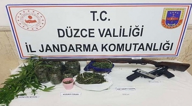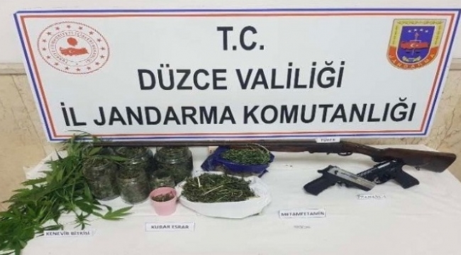 Düzce'nin Çakırlar mahallesinde Jandarma ekiplerince bir ihbar sonucu yapılan operasyonda, V. B.'nin ikametine baskın düzenlendi.Yapılan aramada, 6 adet kavanoz, 2 adet poşet ve 1 adet bardak içerisinde toplam 1 kilo 80 gram esrar, 1 fişek metamfetamin, 2 kök kenevir bitkisi, 2 adet kuru sıkı tabanca ve 1 adet av tüfeği ele geçirdi.Olayla ilgili soruşturma sürüyor.