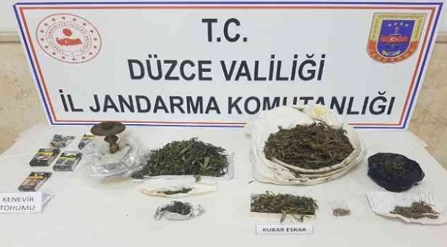 Düzce’de jandarma ekiplerinin bir eve düzenlediği operasyonda 758 gram kubar esrar ve 62 gram kenevir tohumu ele geçirildi.Eminaçma köyünde bir şahsın evinde uyuşturucu madde bulundurduğu istihbaratını alan Jandarma ekipleri operasyon düzenledi. Yapılan aramada 758 gram kubar esrar maddesi ve 62 gram kenevir tohumu ele geçirildi. Öte yandan, Düzce'de uyuşturucu madde ticareti yaptığı tespit edilen şüphelilerin bulunduğu otomobil, narkotik polisi tarafından takip edildi. Otomobil bir süre takip edildikten sonra Burhaniye Mahallesi'nde durduruldu. Araç içerisinde bulunan 2 şüpheli üzerinde, otomobilde ve evlerinde detaylı arama yapıldı. Yapılan aramalarda 2 parça halinde 55 gram esrar, 1 adet hassas terazi ele geçirildi. Her iki olayla ilgili soruşturma sürüyor.