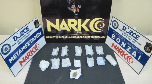 Düzce Azmimilli Mahallesinde uyuşturucu madde ticareti yaptığı tespit edilen şüpheli 2 şahıs yapılan operasyon neticesinde yakalandı.Yakalanan şüphelilerin üzerinde ve ikametlerinde yapılan aramalarda satışa hazır vaziyette 11 fişek halinde toplam 10 gram Metamfetamin maddesi ve bir miktar Sentetik Kannobinoid maddesi ele geçirildi.2 şahıs tamamlanan işlemlerinin ardından Uyuşturucu Madde Ticareti Yapmak suçundan sevk edildiği Sulh Ceza Hakimliğince tutuklanarak Cezaevine teslim edildi.