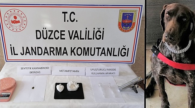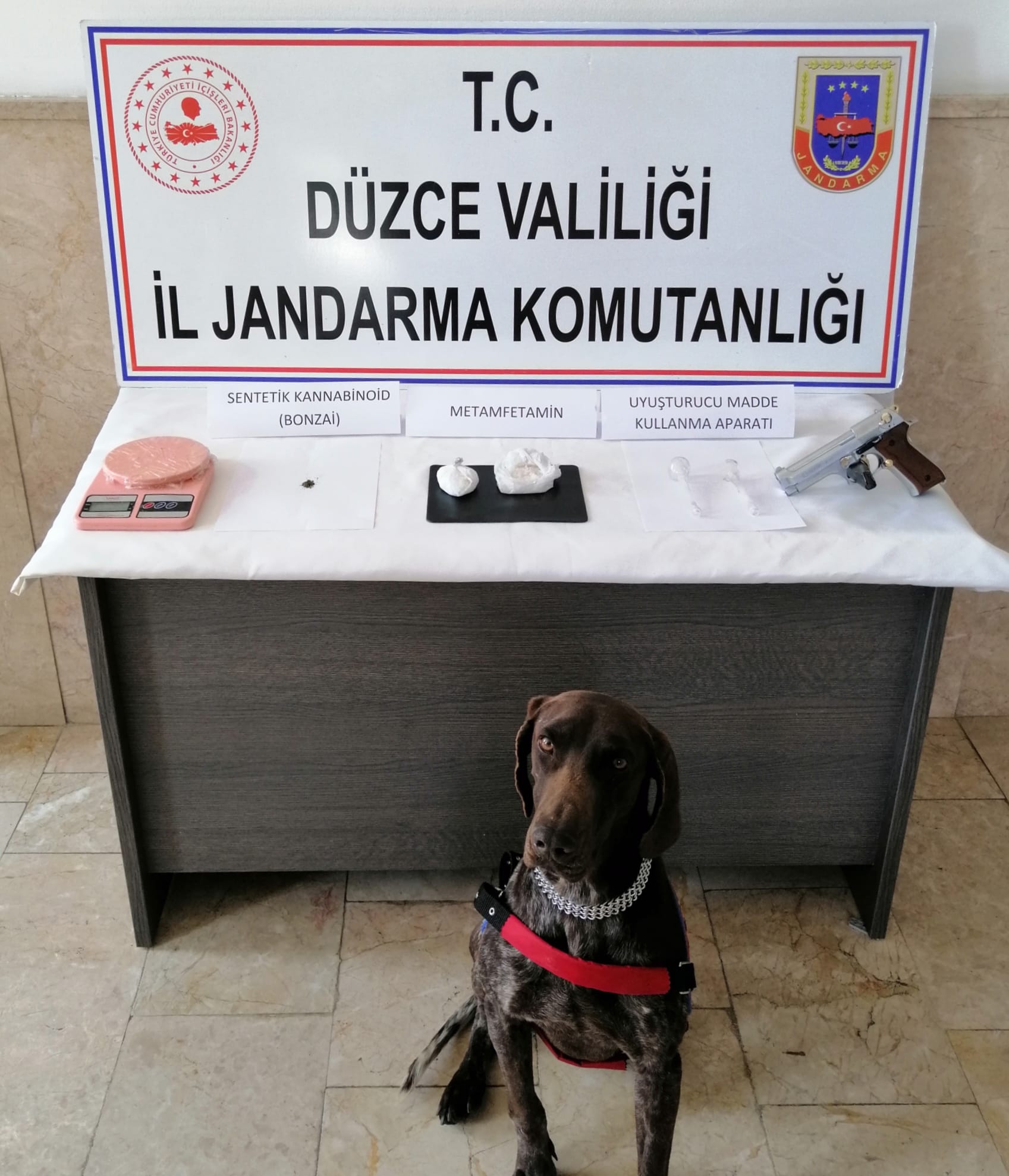 Düzce il jandarma Komutanlığı KOM Şube Müdürlüğü ve İl Merkez İl Jandarma Komutanlığı ekipleri, İstanbul’dan Düzce’ye uyuşturucu sevkiyatı yapıldığı belirlenen bir aracı takibe aldı.Ekipler, yaptıkları araştırmalar sonucunda takibe alınan aracın Düzce’nin Merkeze bağlı Uzun Mustafa Mahallesi 814. sokak girişinde park halinde olduğunu tespit etti. Araç içinde bulunan F.T. ve N.Ü. üzerinde ve araçta yapılan aramada beyaz naylona sarılı yaklaşık 52 gram Metamfetamin, beyaz kağıda sarılı yaklaşık 0,5 gram Bonzai, 2 adet uyuşturucu madde kullanma aparatı (payp) ve 1adet namlusu açılmış Kuru sıkıdan çevirme tabanca ele geçirildi.Aynı sokakta şüphelilerden F. T’ye ait ikamet adresinde yapılan aramada yaklaşık (35) gram Metamfetamin ile (1) adet hassas terazi ele geçirildi.Cumhuriyet Savcısının talimatı ile şüpheli şahıslar Uyuşturucu Madde İmal ve Ticareti yapmak suçundan yarın adli makamlara sevk edilmek üzere gözaltına alındı.